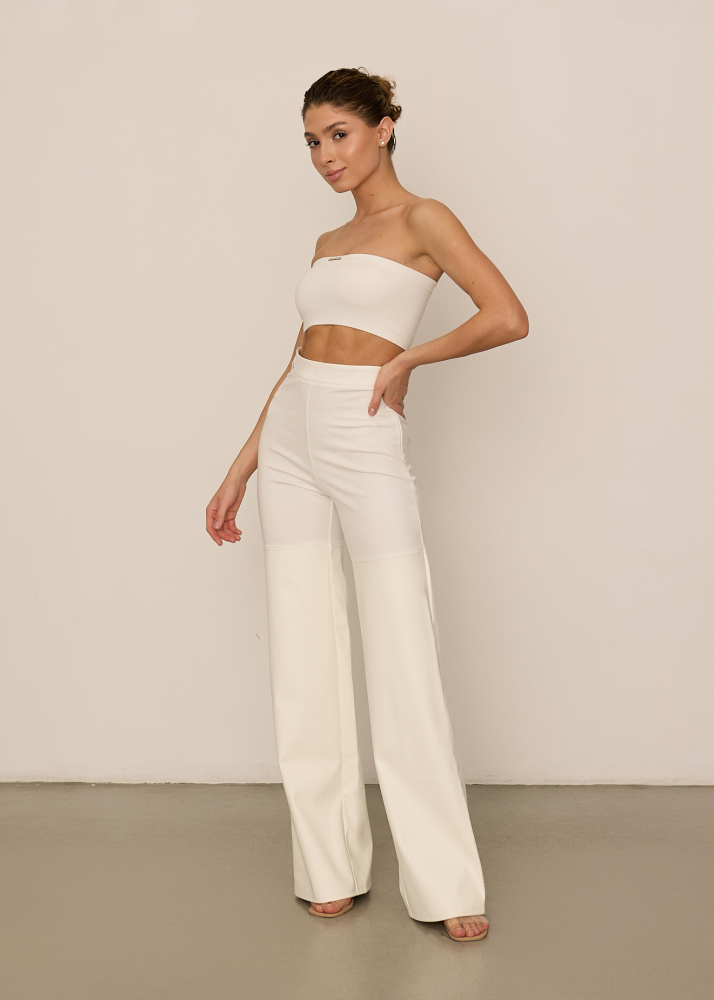 Комбинированные брюки с завышенной талией с идеальной посадкой. Верхняя часть брюк выполнена из трикотажа-джерси, нижняя часть из эко-кожи. Сбоку фирменный металлический лейбл.