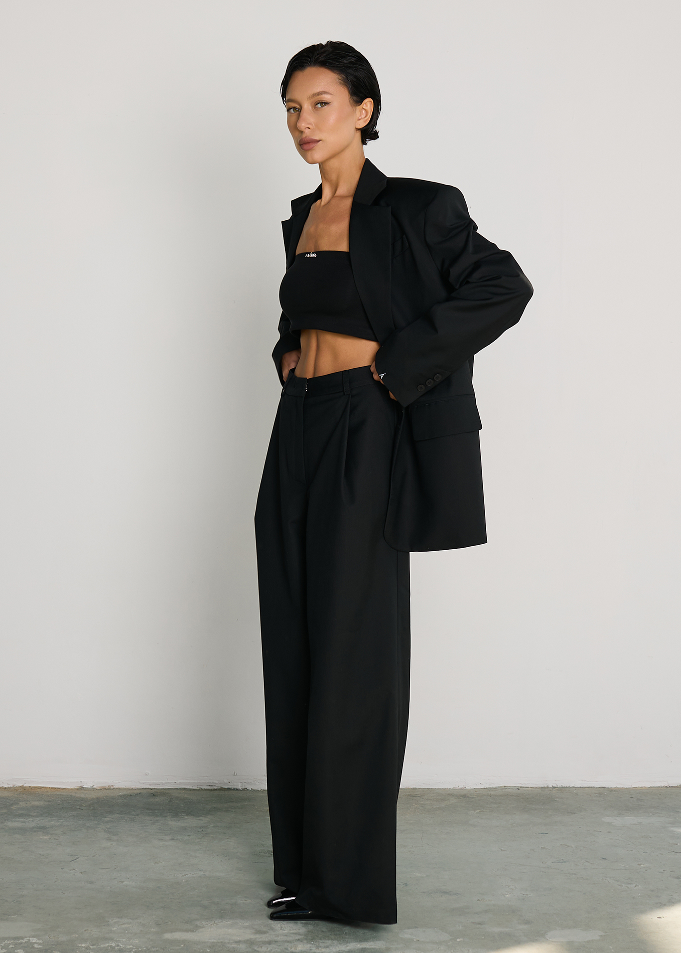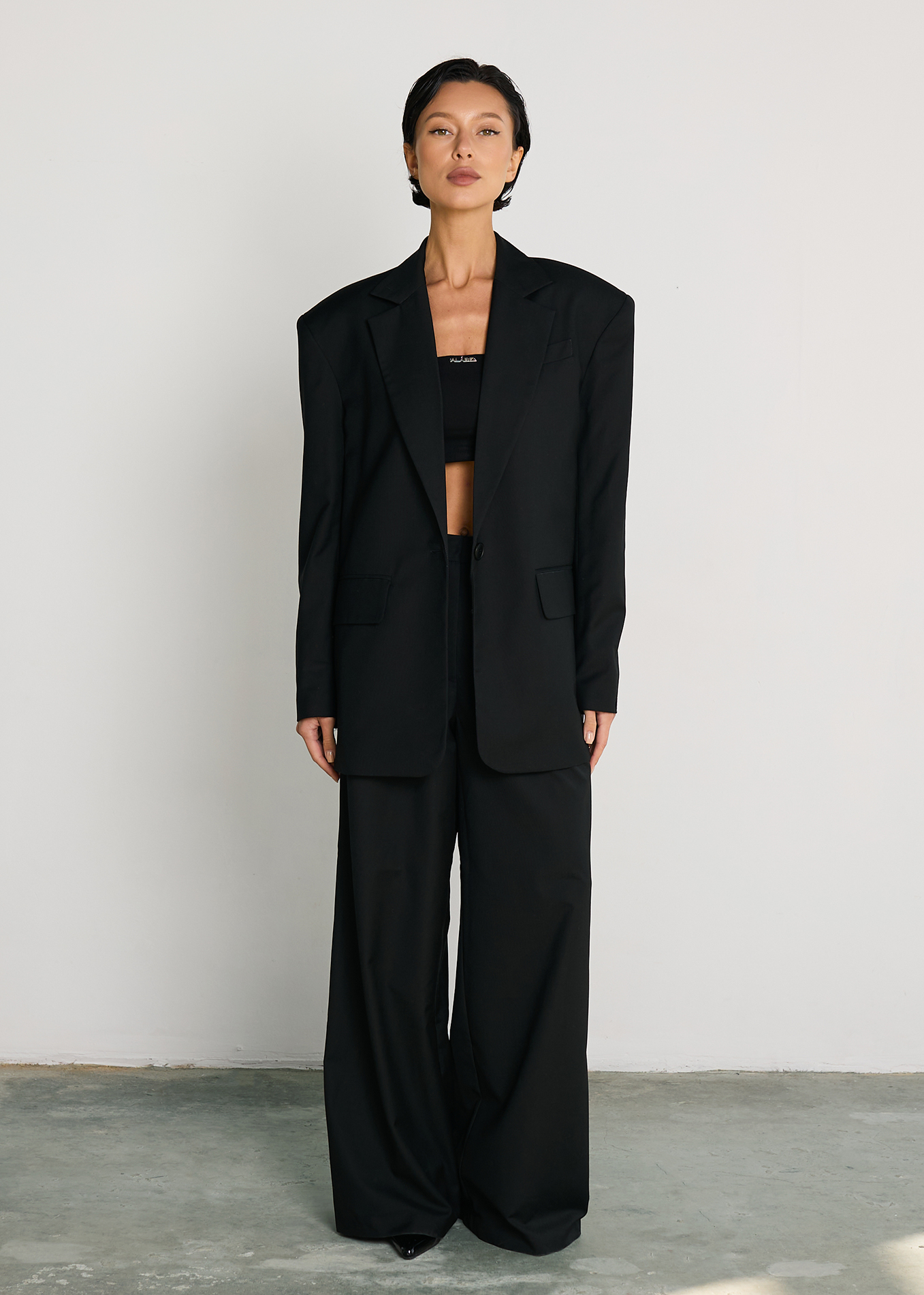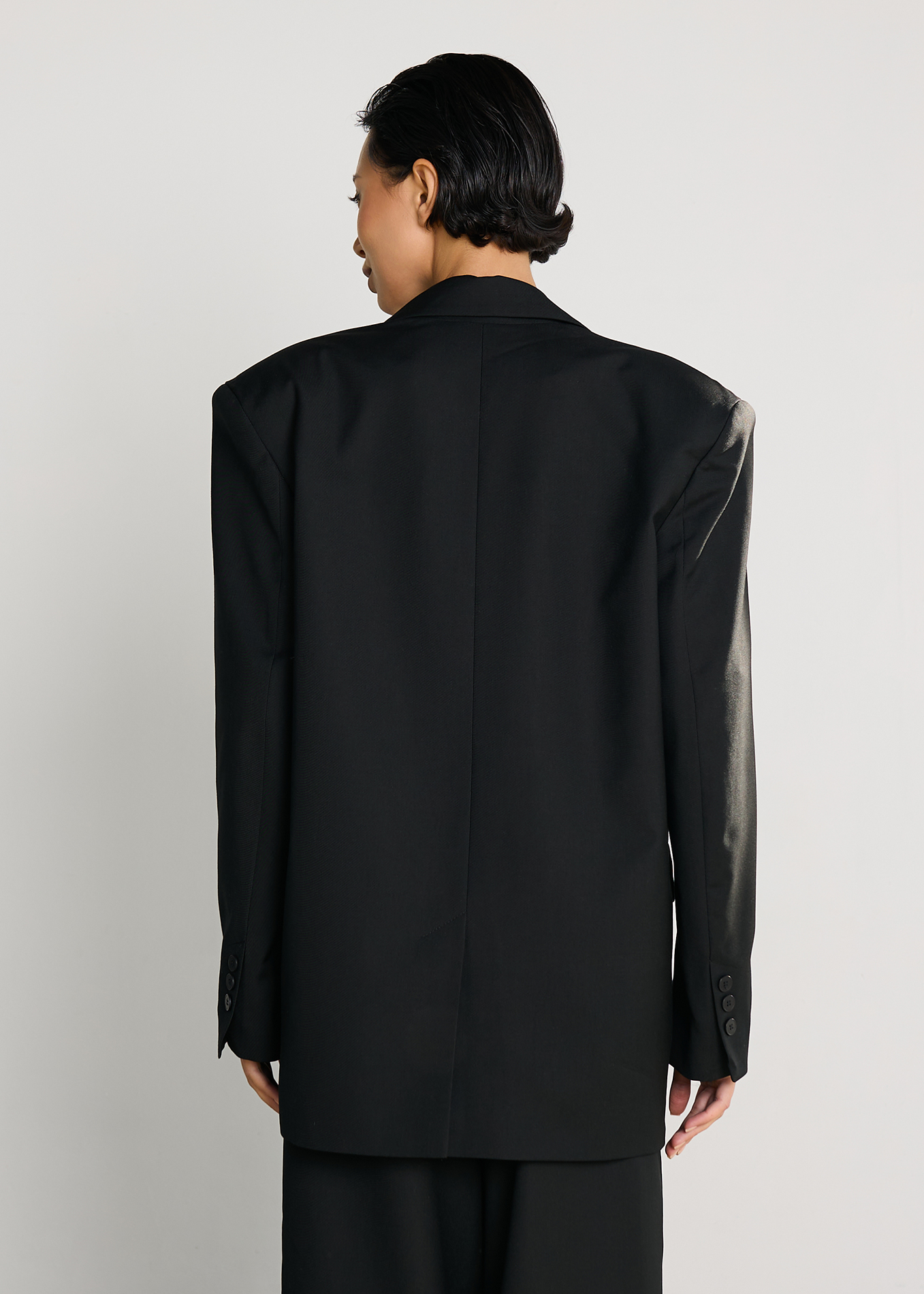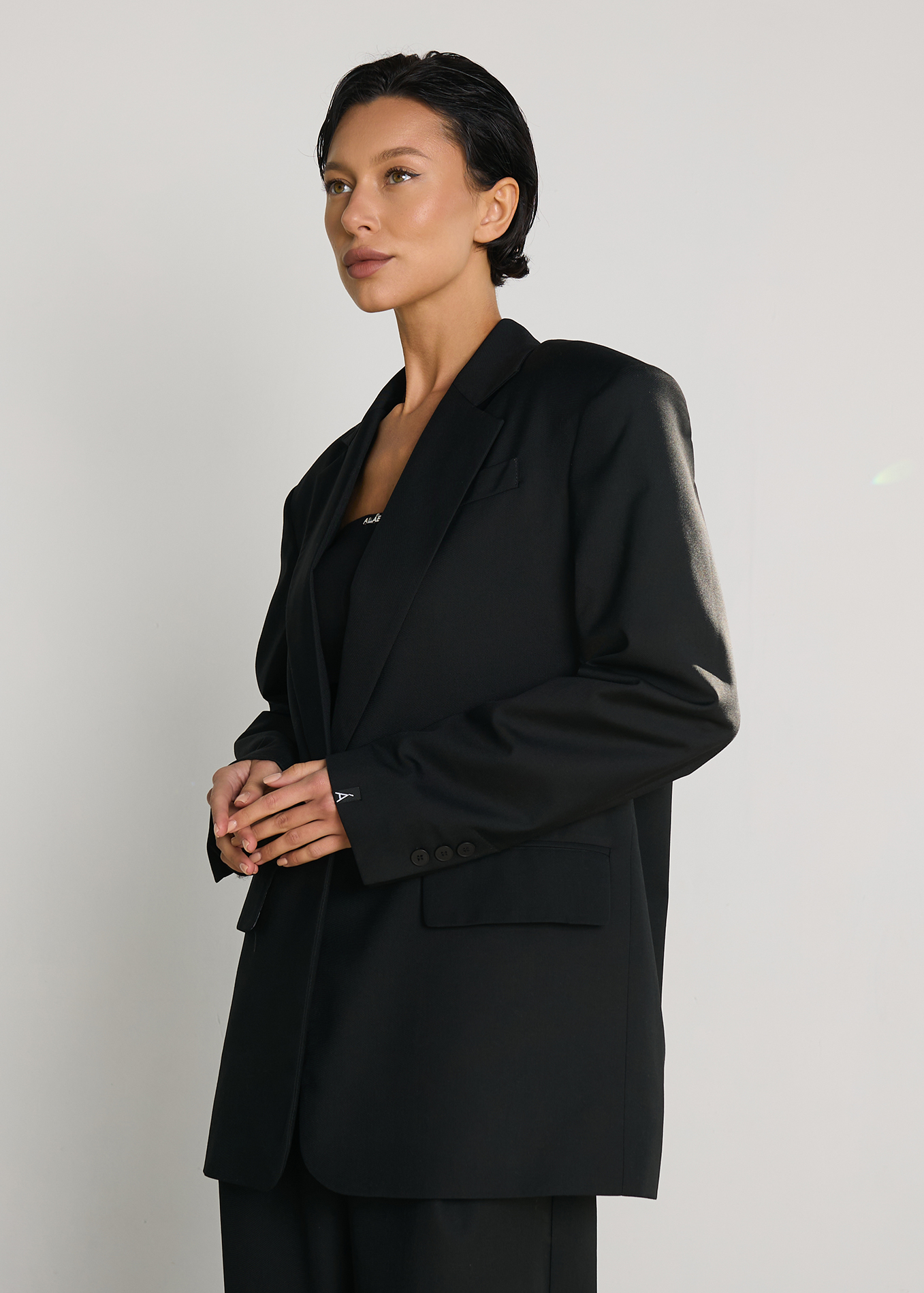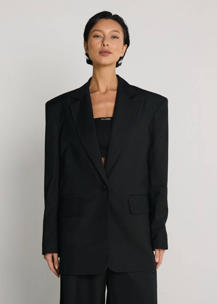 Однобортный пиджак oversize кроя с застежкой на пуговице. Отложной воротник с прямоугольными лацканами. Длинные рукава с пуговицами на манжетах, подплечники. Декоративные карманы.