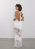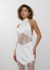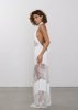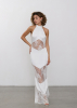 Платье длины макси с открытой спиной и горловиной халтер. Сатиновая ткань в комбинации с французским кружевом плавно облегает силуэт, подчеркивая фигуру. Горловина халтер акцентирует внимание на плечах и шее, в то время как открытая спина добавляет нотку соблазнительности и загадочности.