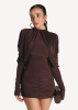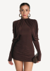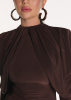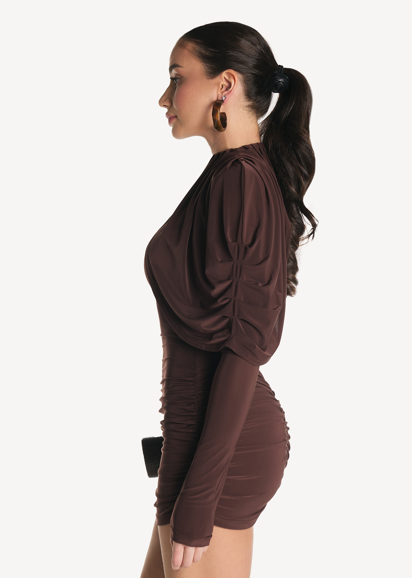 Облегающее платье мини с выразительной драпировкой и архитектурными деталями. Мягкий эластичный материал точно повторяет силуэт, подчеркивая фигуру и создавая эффект «второй кожи».