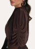 Акцентные накидные рукава формируют благородный объем в зоне плеч и добавляют образу драматичности, сохраняя при этом чистоту линий. Драпировка по центру визуально вытягивает силуэт и делает посадку максимально комплиментарной.