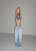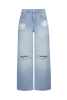 Расслабленные джинсы с широкими штанинами и разрезами. Низкая посадка, потертости на карманах, свободный силуэт.