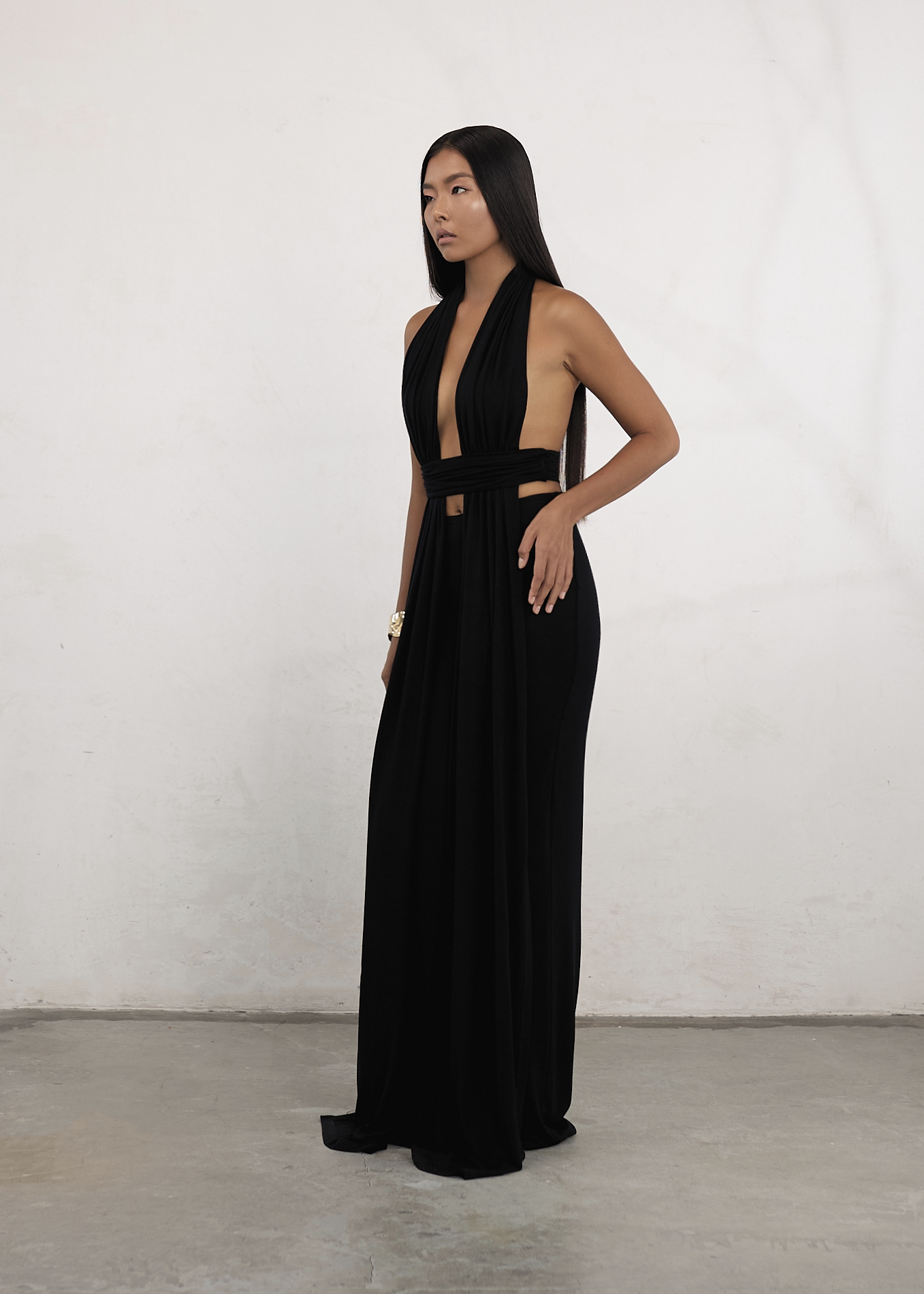 Платье макси из мягкой вискозы. Декоративные полосы ткани, ниспадающие от плеч к полу, напоминают водопад среди тропиков, добавляя образу лёгкость и динамику. Силуэт создан за счёт акцентной линии по талии и открытой спины. Платье имеет двойной слой, что гарантирует комфорт в носке.