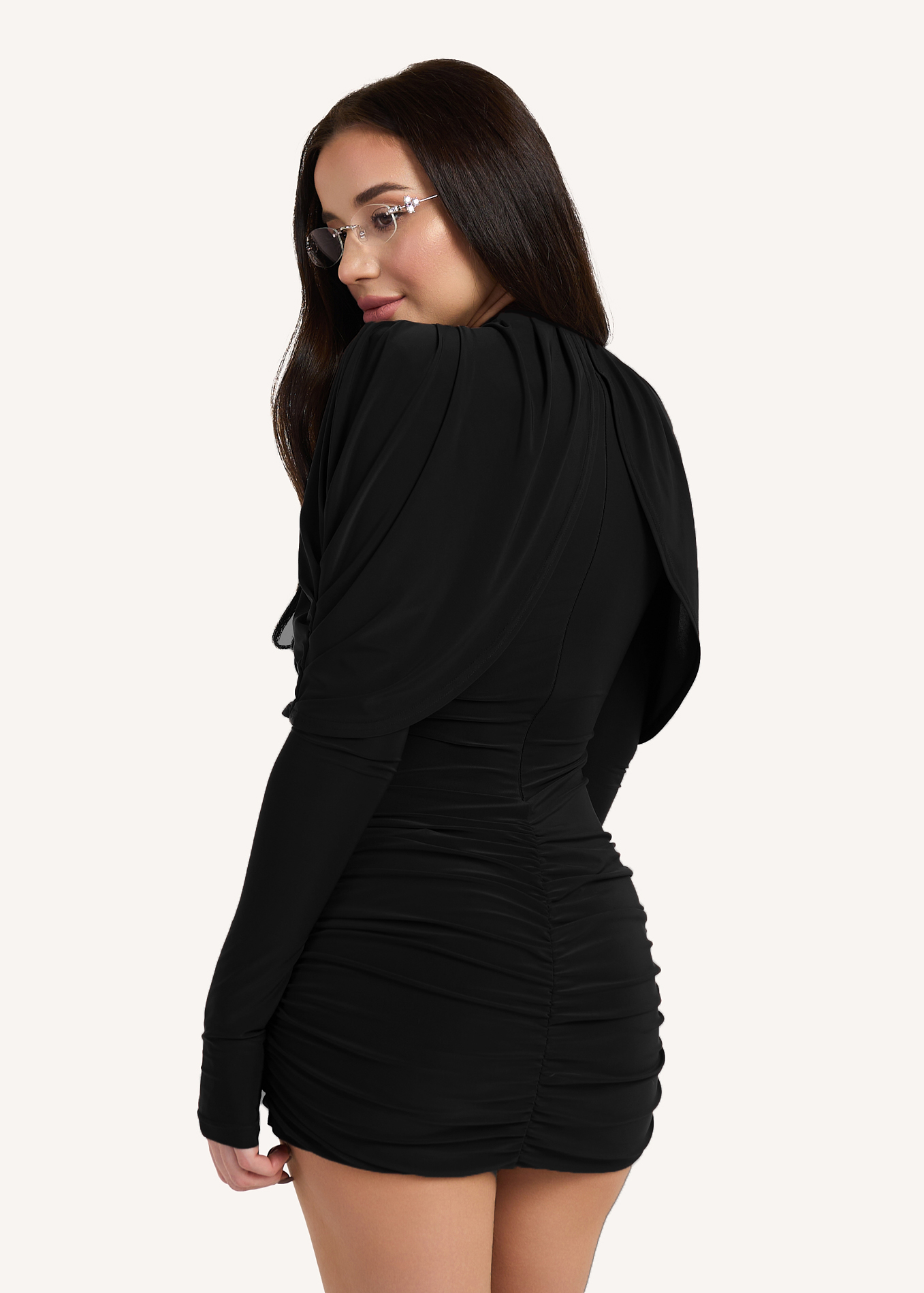 Облегающее платье мини с выразительной драпировкой и архитектурными деталями. Мягкий эластичный материал точно повторяет силуэт, подчеркивая фигуру и создавая эффект «второй кожи».