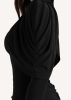 Акцентные накидные рукава формируют благородный объем в зоне плеч и добавляют образу драматичности, сохраняя при этом чистоту линий. Драпировка по центру визуально вытягивает силуэт и делает посадку максимально комплиментарной.