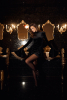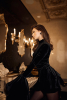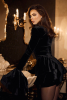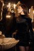 Платье длины мини из мягкого бархата. Объемные воланы на манжетах и бёдрах добавляют образу драматичности, а подплечники и воротник-стойка создают правильный силуэт.
