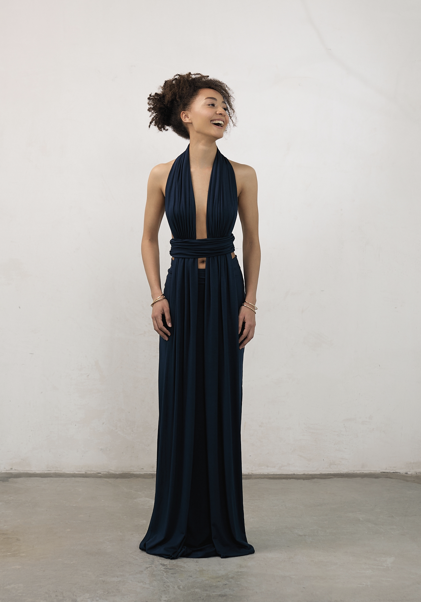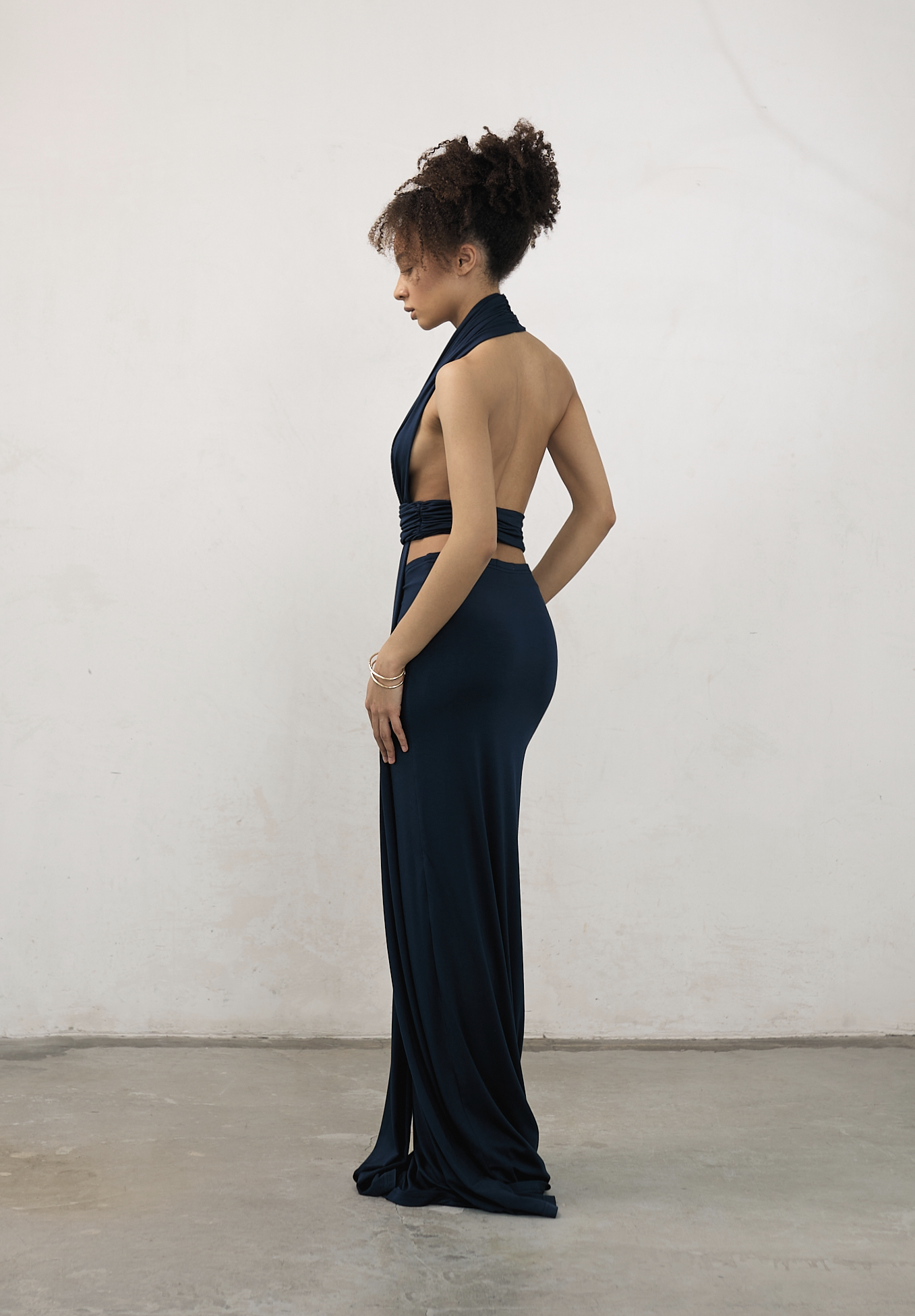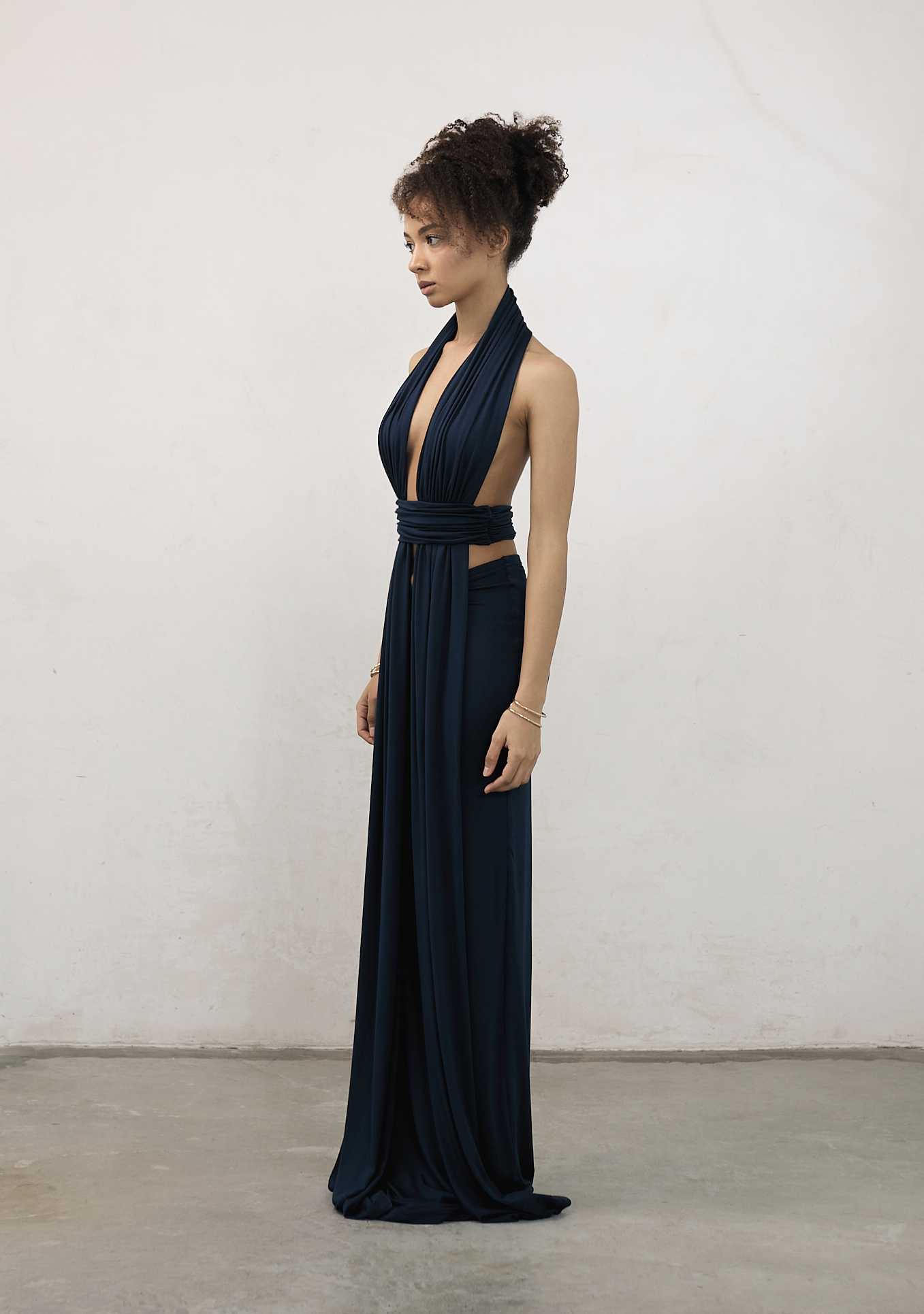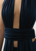 Платье макси из мягкой вискозы. Декоративные полосы ткани, ниспадающие от плеч к полу, напоминают водопад среди тропиков, добавляя образу лёгкость и динамику. Силуэт создан за счёт акцентной линии по талии и открытой спины. Платье имеет двойной слой, что гарантирует комфорт в носке.