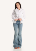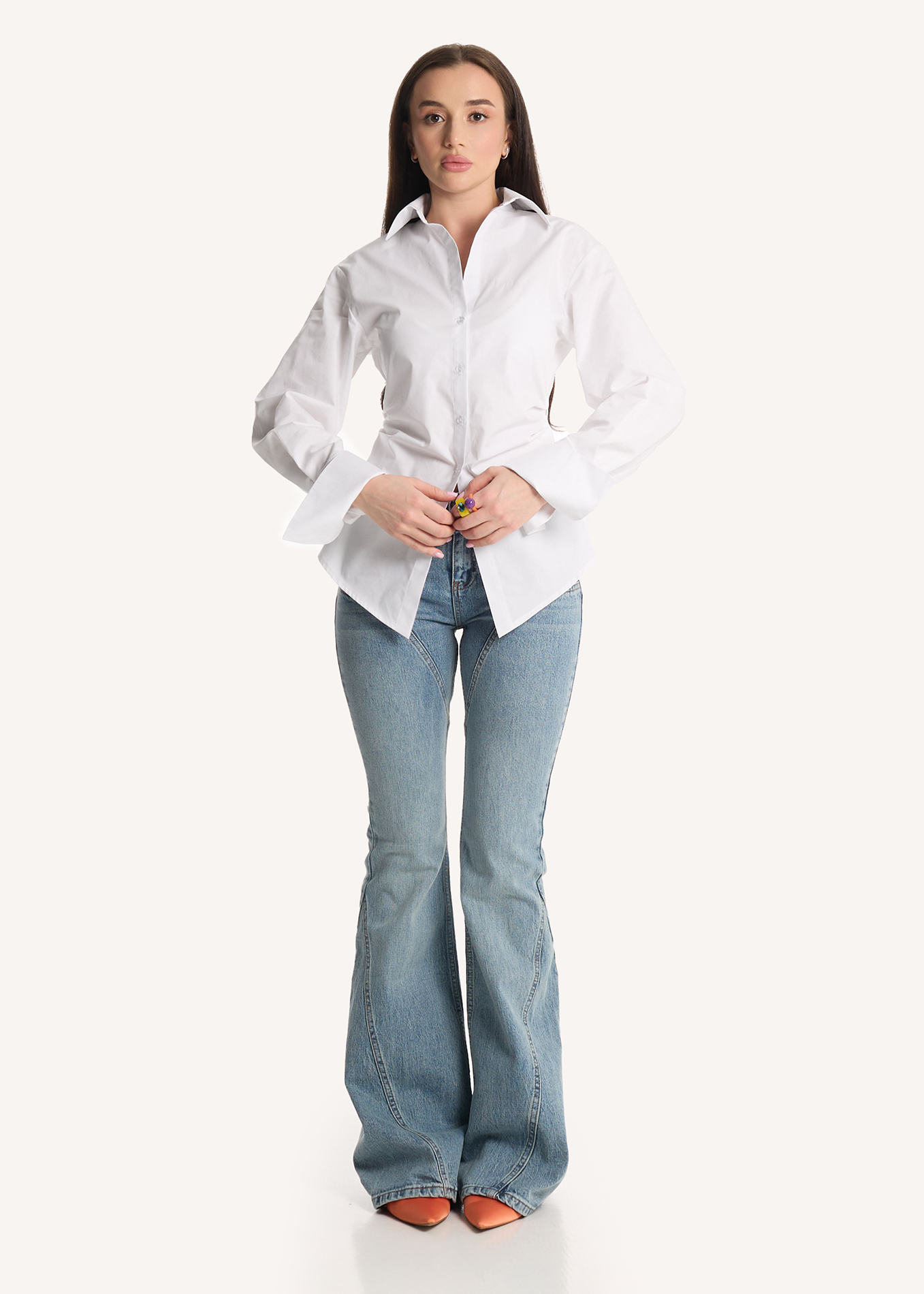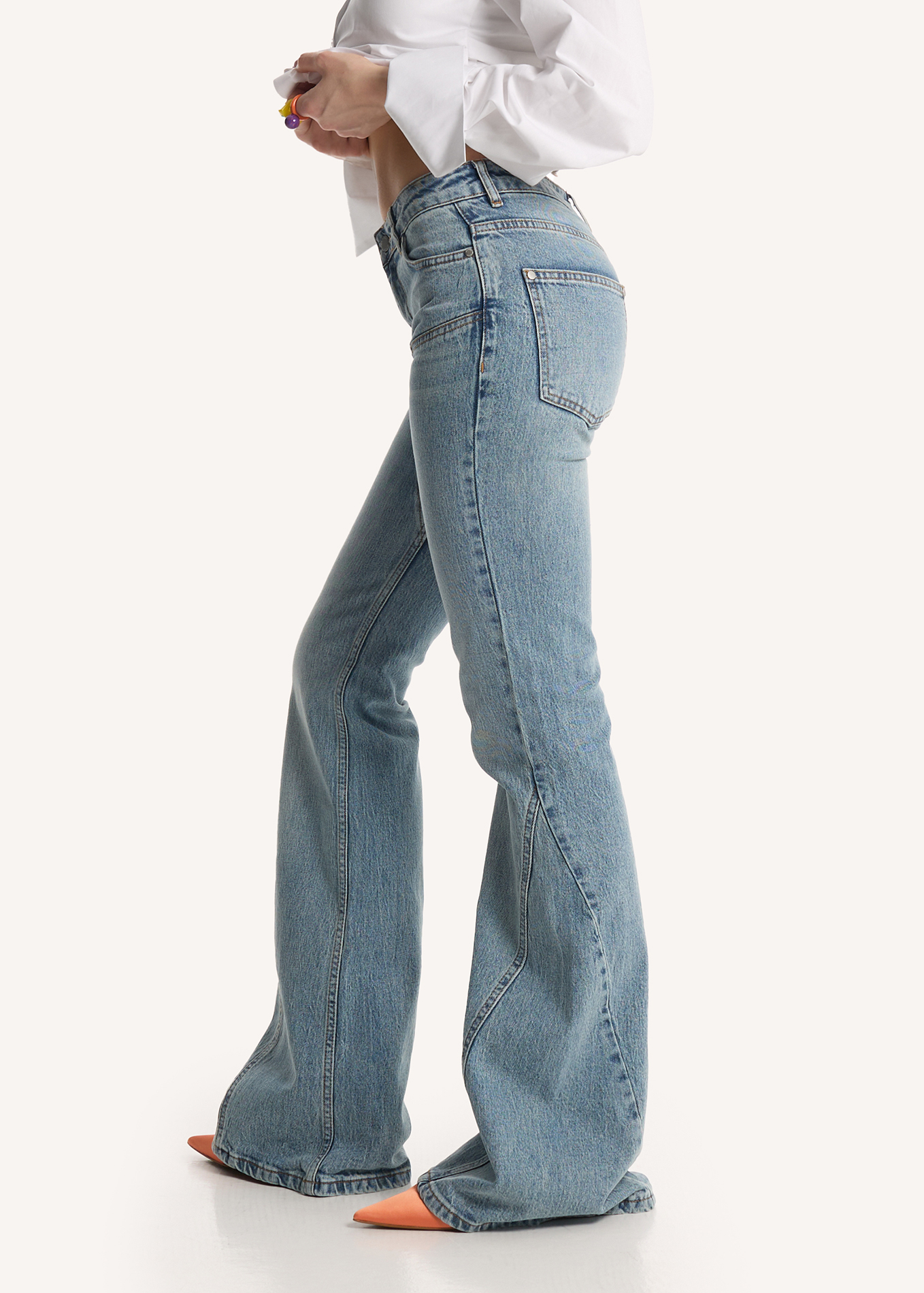 Лаконичные джинсы с мягким клешем и посадкой ниже талии, которые визуально вытягивают силуэт и добавляют образу лёгкость.